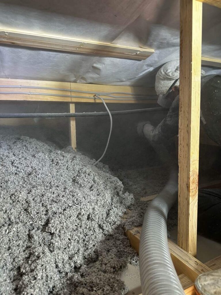 断熱材には、熱をゆっくり伝える性質をもつセルロースファイバーを採用しました。自社の大工が一つひとつ、丁寧に吹き込み施工しています。