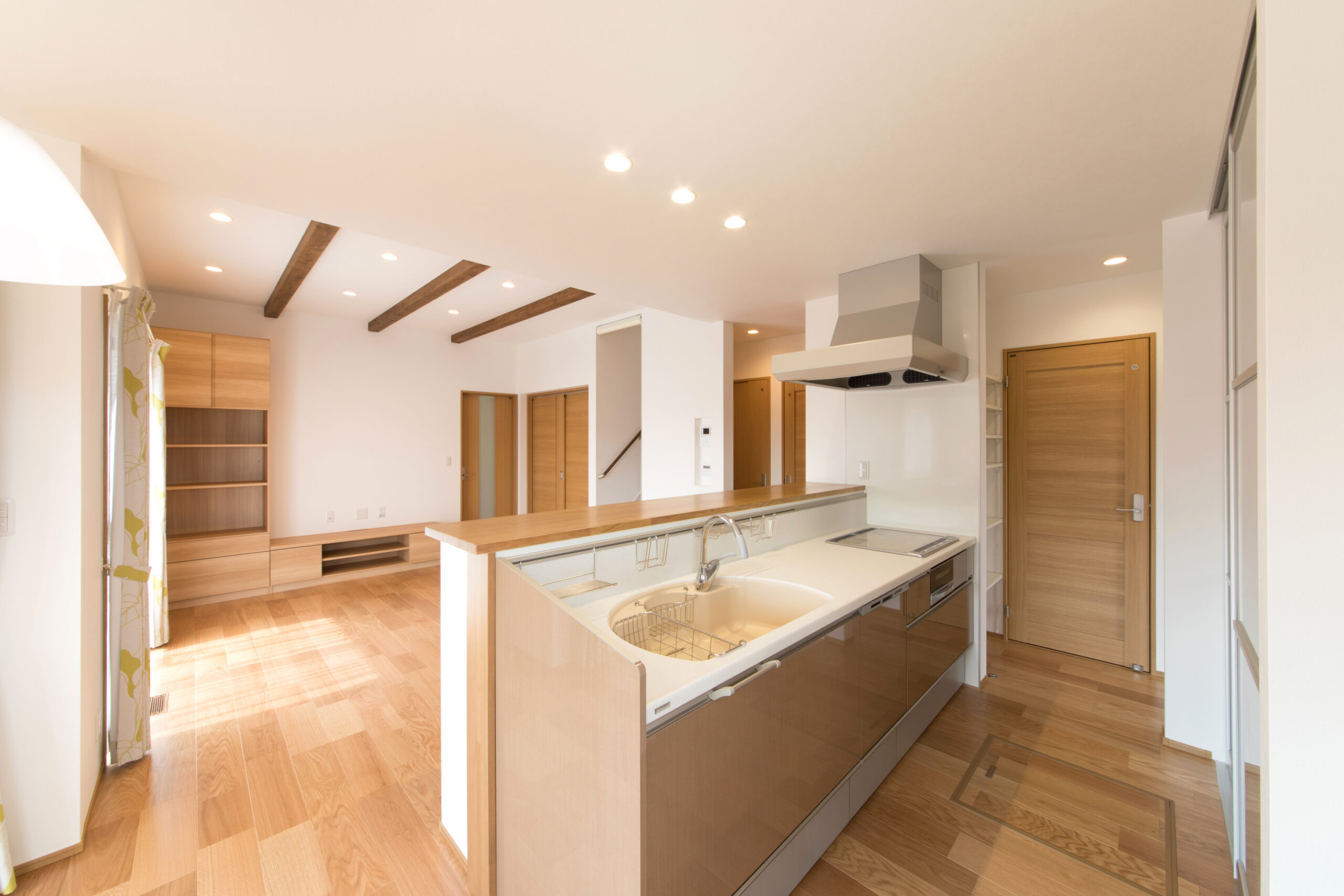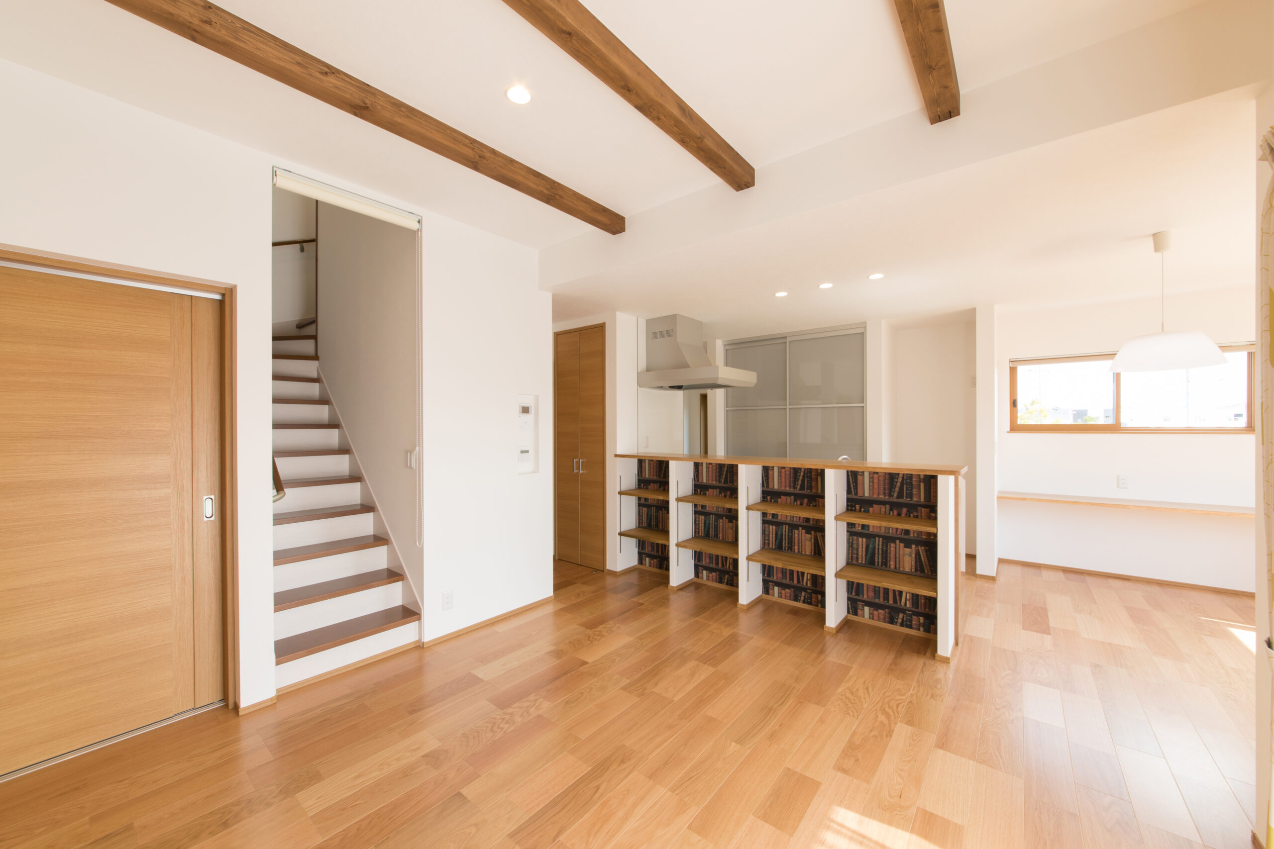 白い壁に随所に使われた無垢材が映える邸宅