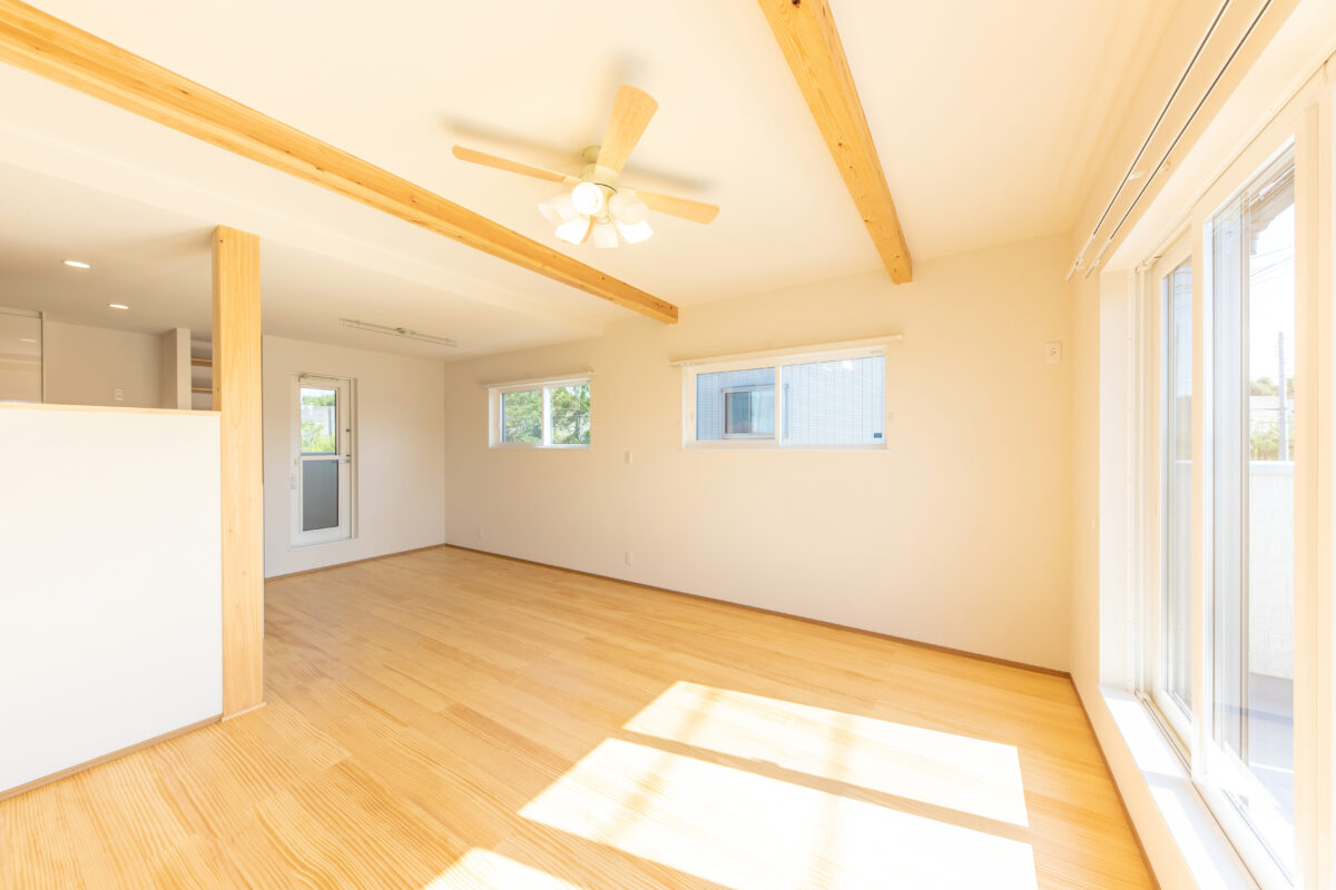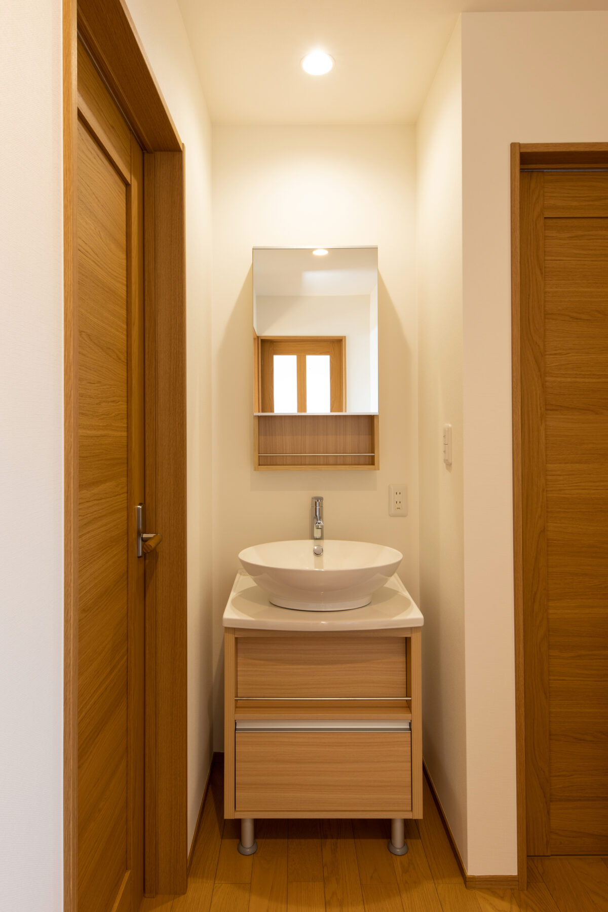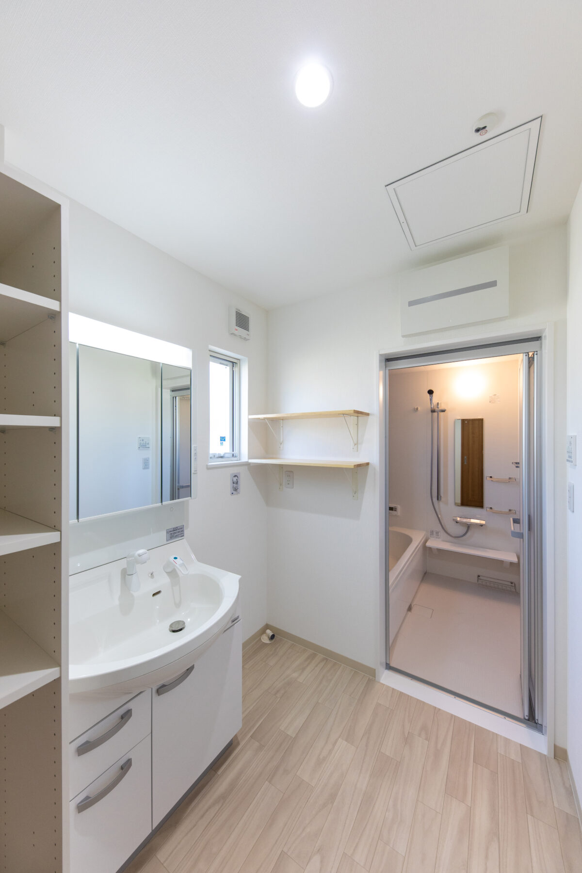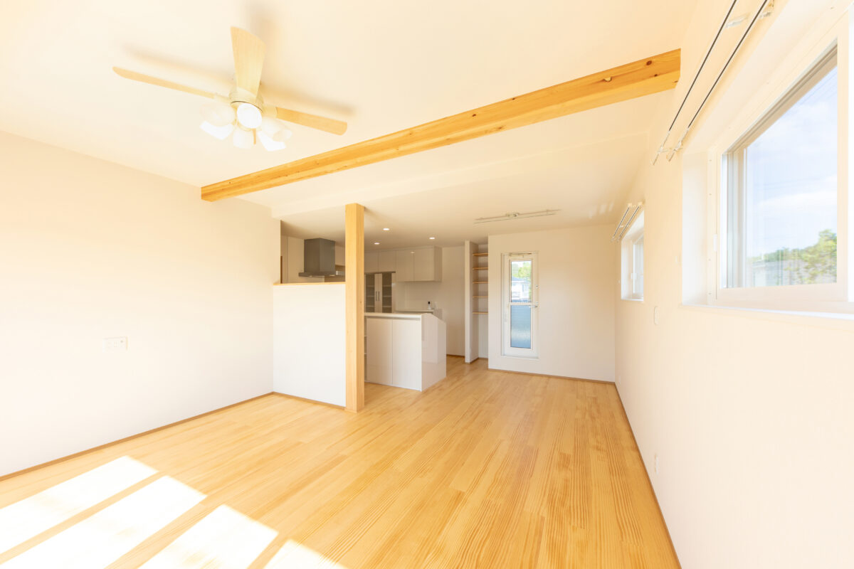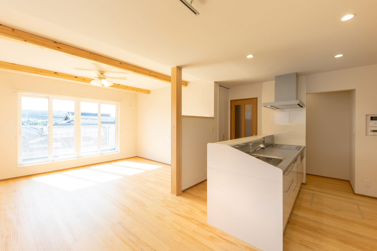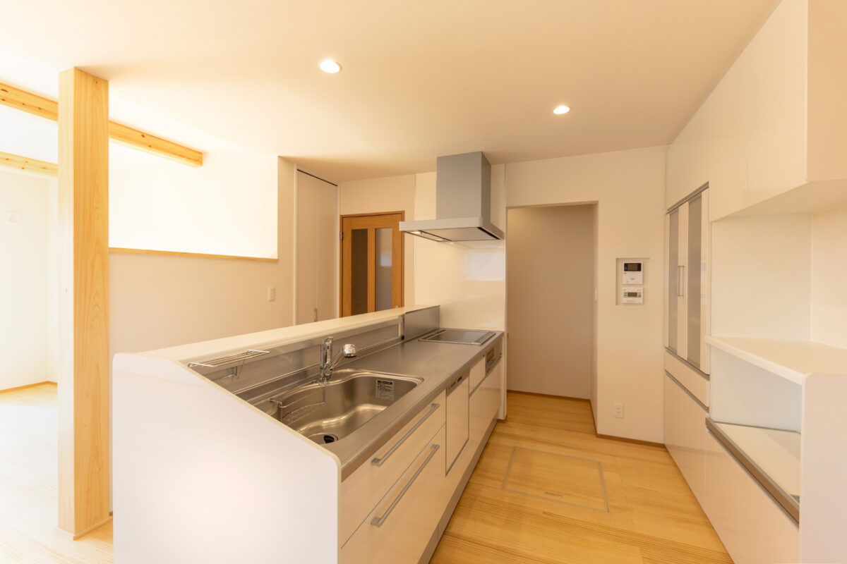 自然素材に包まれ自然光あふれる広々としたLDK(加東市 K様邸) キッチン 加東市 収納充実 明るく広々 洗面台 浴室 無垢材 玄関 第三種換気 自然素材 二階建て 地域加東市 K様 二階建て 施工面積176.51㎡(53.39坪) 延床面積152.78㎡(46.22坪) 間取り5LDK+納戸 性能・第三種換気 コメント二階にLDK