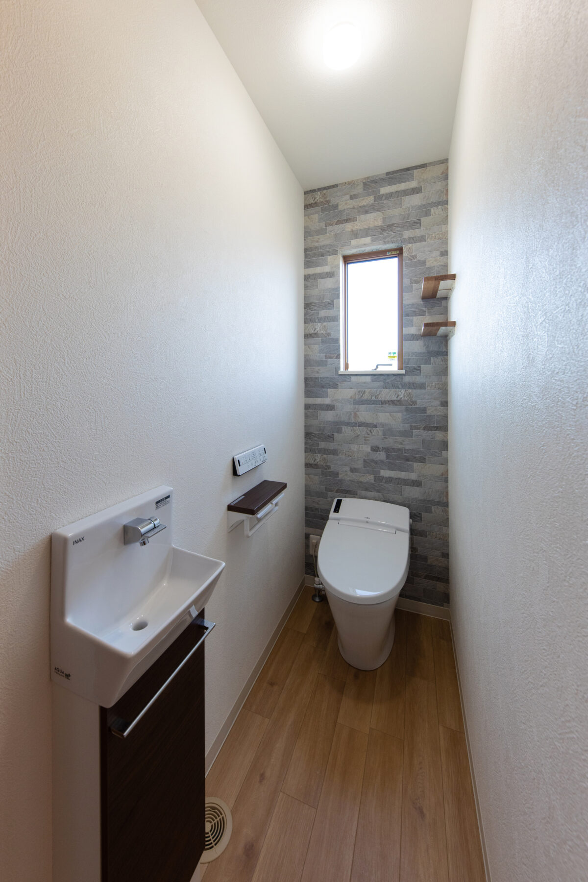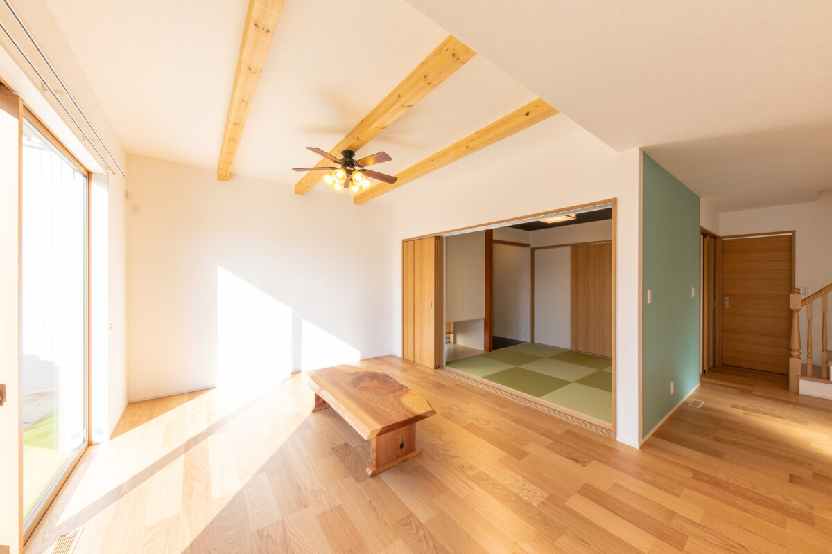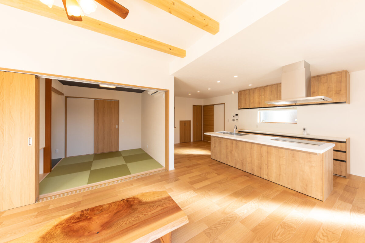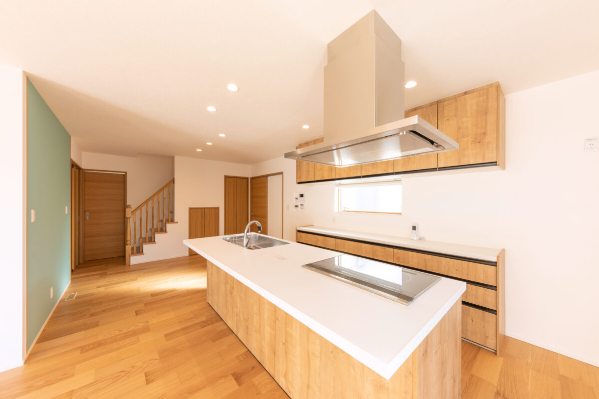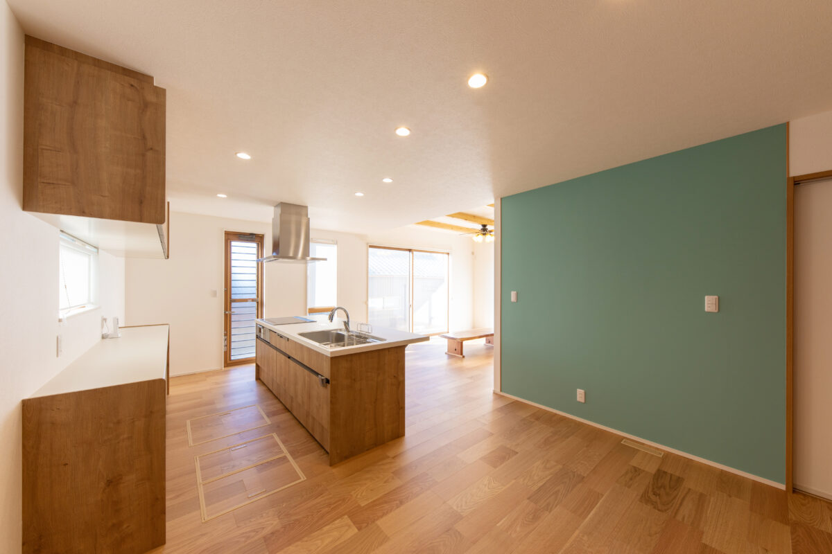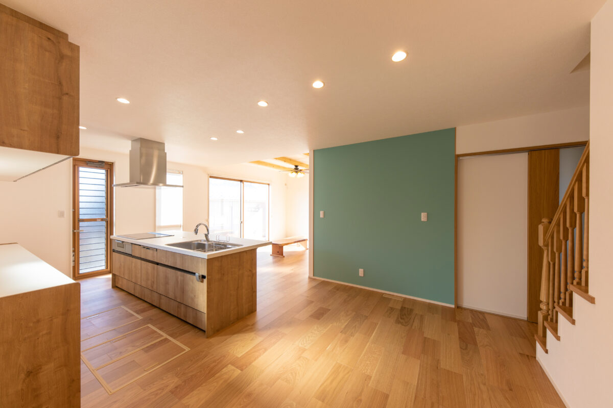 アイランドキッチンにくすみグリーンのアクセントクロスが映えるモダンなLDK 開放感あるZEH住宅(加東市 H様邸) ZEH住宅 ウレタン吹付断熱材 キッチン トイレ 加東市 収納充実 和室 明るく広々 洗面台 浴室 無垢材 玄関 第一種換気(熱交換器) 自然素材 造作家具 二階建て 地域加東市 H様 二階建て 家族構成ご夫婦+お子様2人 施工面積148.76 ㎡(45 坪) 延床面積134.56 ㎡(40.07 坪) 間取り3LDK+和室+SCL+WCL×2+書斎+バルコニー 性能・第一種換気(熱交換器)ウレタン吹付・ZEH住宅