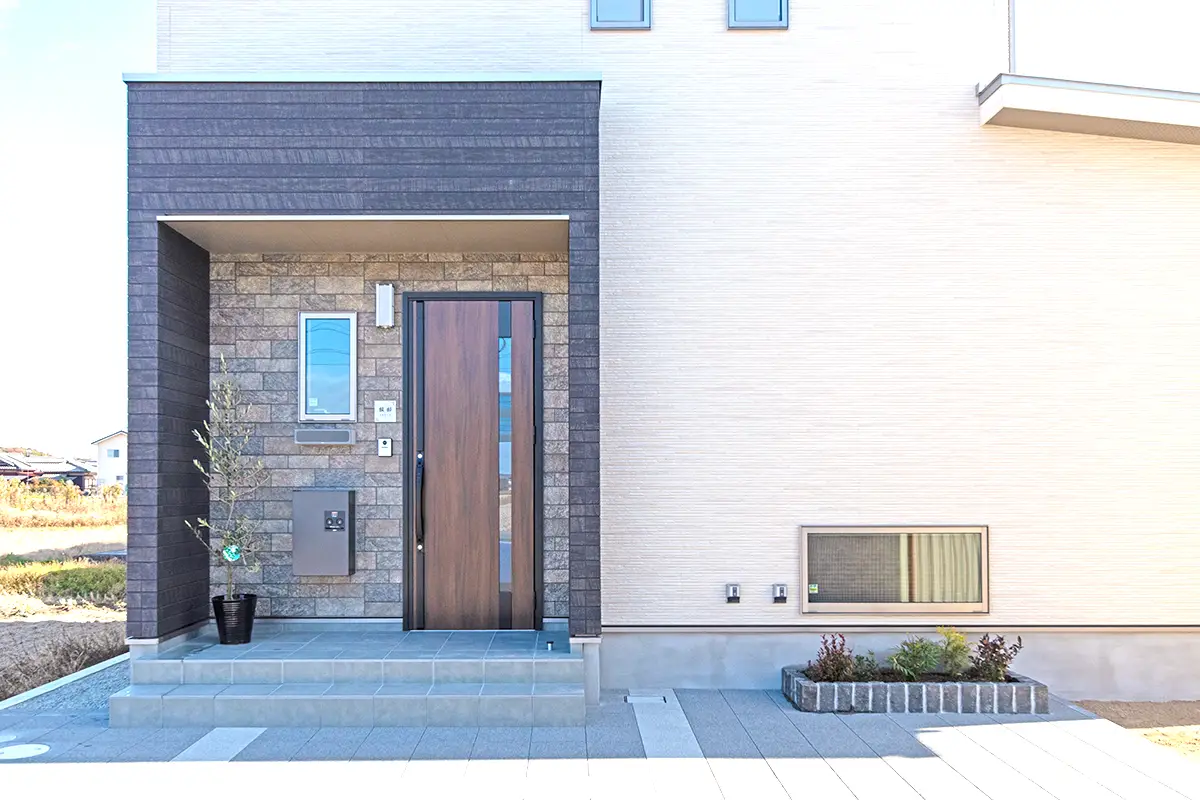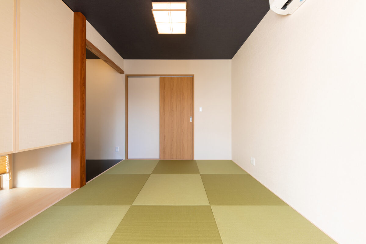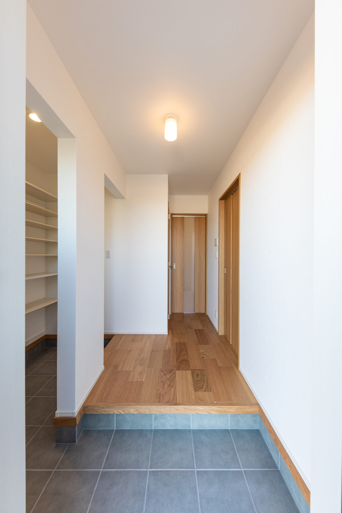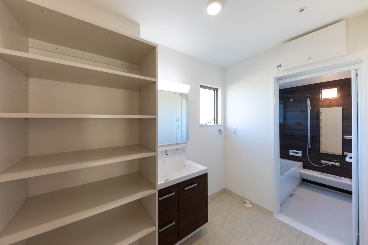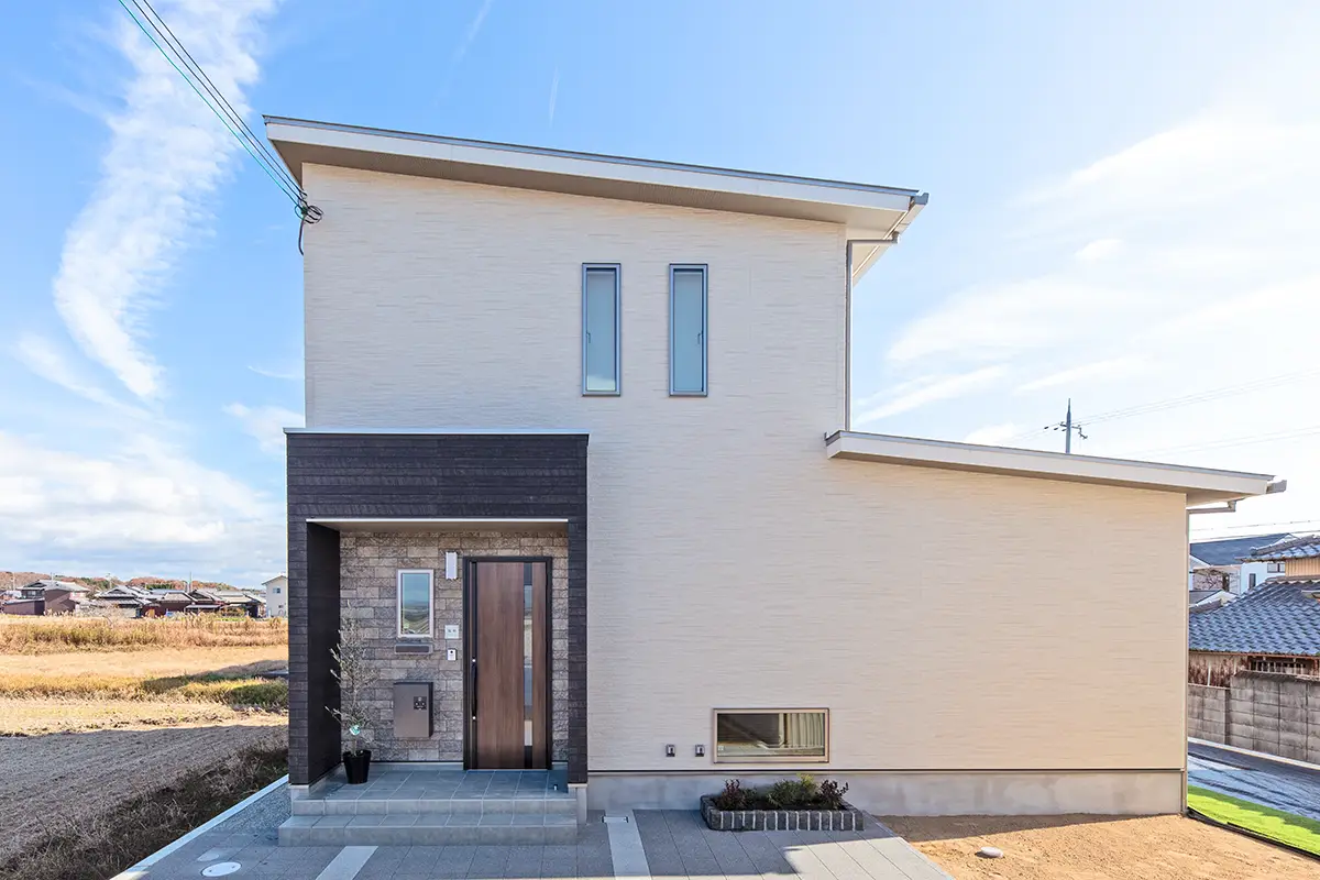 アイランドキッチンにくすみグリーンのアクセントクロスが映えるモダンなLDK 開放感あるZEH住宅(加東市 H様邸) ZEH住宅 ウレタン吹付断熱材 キッチン トイレ 加東市 収納充実 和室 明るく広々 洗面台 浴室 無垢材 玄関 第一種換気(熱交換器) 自然素材 造作家具 二階建て 地域加東市 H様 二階建て 家族構成ご夫婦+お子様2人 施工面積148.76 ㎡(45 坪) 延床面積134.56 ㎡(40.07 坪) 間取り3LDK+和室+SCL+WCL×2+書斎+バルコニー 性能・第一種換気(熱交換器)ウレタン吹付・ZEH住宅